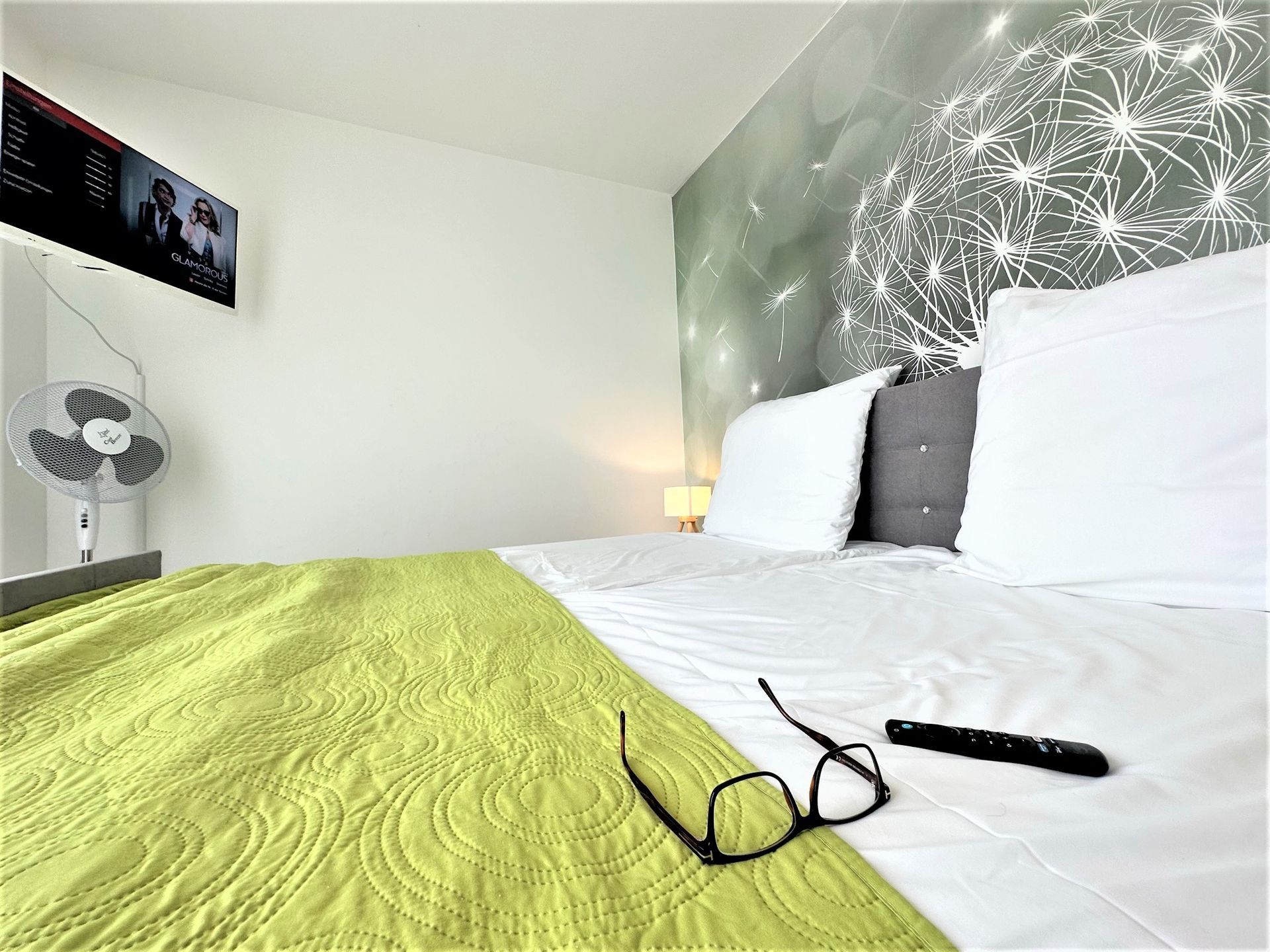 2 Smart TVs, Wohn.- Schlafzimmer, Laptop Tisch + 2 bequeme Polsterstühle, Schnelles WIFI: 100 Mbit